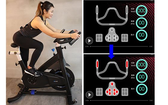 節奏飛輪 (TempoFly) 可模擬飛輪教室之教學情境,讓使用者隨著音樂節奏和教練(影片)動作,透過App提示變換坐姿、站姿、握把接觸位置等,讓使用者自己在健身房/家中也可以輕鬆、有趣的以遊戲方式進行運動健身訓練。例如,一般飛輪課程的坐姿騎乘(請參考附圖),在App上握把和座墊會顯示白色光暈(如附圖右上方所示),當使用者坐到座墊上且手握到握把指示位置時,會有紅色實心填滿(如附圖右下方所示),即表示騎乘姿勢正確。在整個訓練課程結束後給予使用者一個本次運動成效評分,讓使用者在遊戲型態的課程中,兼顧預期的運動成效。