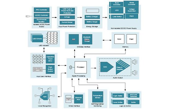 但相比於與互聯網介面結合使用的麥克風和揚聲器, 這些外形看似簡單的設備往往更複雜。智慧音箱包含許多電子功能,這些功能均通過採用數十種複雜的積體電路(IC) 來實現。原始設備製造商 (OEM) 憑藉差異化產品進入智慧揚聲器市場,他們必須決定要提供哪些設備、如何進行提供以及此類小型低功耗設備中可採用的折衷方案。