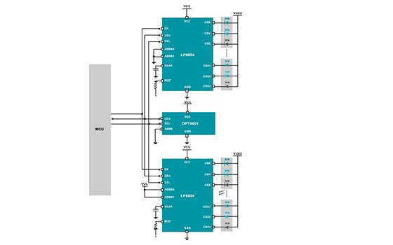 如圖 6 所示,各種LED 環形燈照明圖案參考設計說明了如何使用裝有集成式LED 引擎的新型多通道RGB LED 驅動器設計多色RGB LED 環形燈圖形子系統。使用環境光感測器 IC 可自動控制LED 亮度。