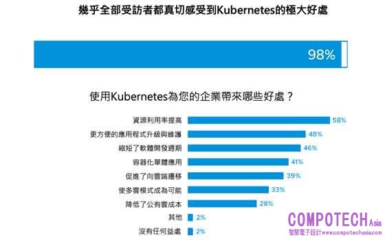 • 「提⾼資源利⽤率」、「簡化應⽤程式更新和維護」,以及「縮短軟體發展週期」被評為使⽤ Kubernetes 的三⼤益處;