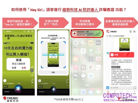 趨勢科技持續投入資源升級旗下產品AI防詐達人,開放支援 iOS系統版本v16.以上的「Hey Siri」語音助理功能,特別針對習慣語音操作的使用者與銀髮族設計,透過說出「Hey Siri,這是詐騙嗎?」簡單語音指令,立即啟動防詐查證、截圖可疑訊息,並自動導入AI防詐達人進行即時判讀,帶來「開口即識詐」的全新體驗!