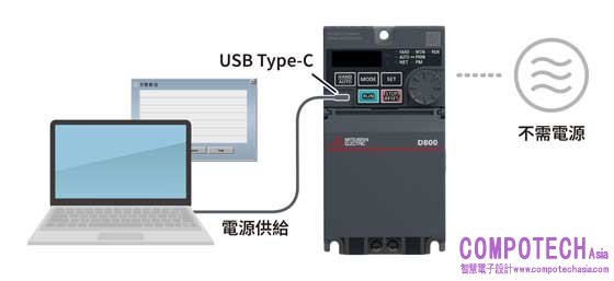 FR-D800系列變頻器著重使用的便利性:表面蓋板採用門片式設計和整合式接線,使安裝更便利、快速。相比前一代同等級的產品體積縮小37%*1,縮小設備機台的尺寸要求,可使設備安裝更靈活且降低安裝成本。全新USB Type-C介面,也讓使用者可直接從電腦設定參數,不需另外啟動變頻器,簡化設定與維護程序。