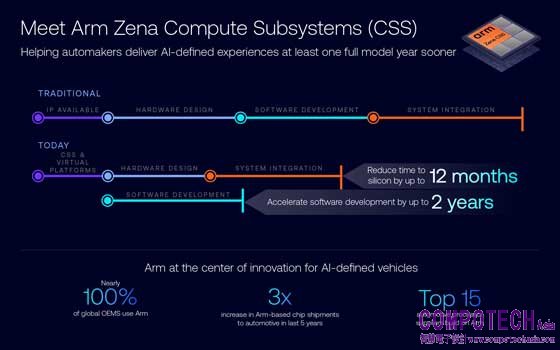 2025年6月5日--Arm 控股有限公司(納斯達克股票代碼:ARM,以下簡稱 Arm)今日宣佈推出 Arm Zena 運算子系統(Compute Subsystems, CSS),這套標準化、預整合的運算平台可為汽車製造商大幅縮短開發週期,並讓軟體團隊在晶片尚未就緒前即可提前著手開發,進而加速其新車型的上市時程,至少可提早一年。