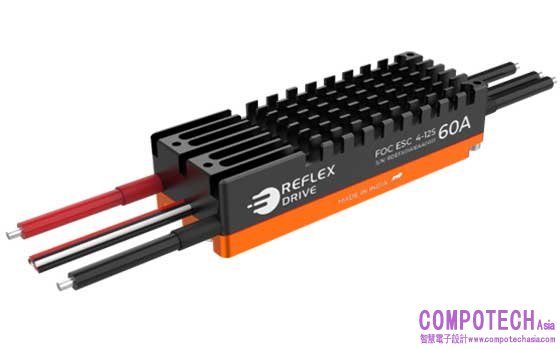 Reflex Drive的場定向控制(FOC)電子調速器(ESC)可提升馬達效率,並實現精準控制。其高性能無刷直流馬達(BLDC)專為優化飛行控制設計,並支援驅動系統的預測性維護。其ESC重量僅180 g,體積僅120 cm³,可持續輸出3.8 kW功率(12S/48V,80 A持續電流)。憑藉其輕量化設計、強大的功率輸出,以及即便在嚴苛天氣條件下仍能保持一致的FOC控制能力,該ESC很適合推力範圍在15至20 kg的馬達,因此特別適用於農業噴灑技術、種子播撒、小型物流和貨物運輸等領域的無人機應用。