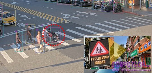 圖說:資策會開發的「i-RSU智慧路側單元」,運用AI影像辨識技術,能即時偵測輪椅用路人穿越路口的動態,並透過電子看板警示鄰近駕駛人。