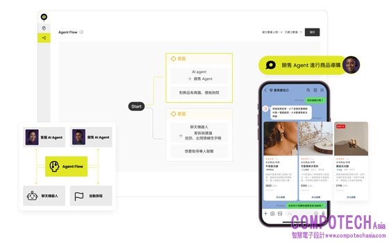 「 Agent Flow」 是透過 Agentic WorkFlow 技術重塑顧客體驗,24/7 自動處理複雜工作,讓多 AI Agent、聊天機器人(Rule-based Chatbot)與自動旅程(Marketing Automation, MA)無縫協作。在對話中能依照語境即時切換角色,執行銷售、客服、推播等不同任務。