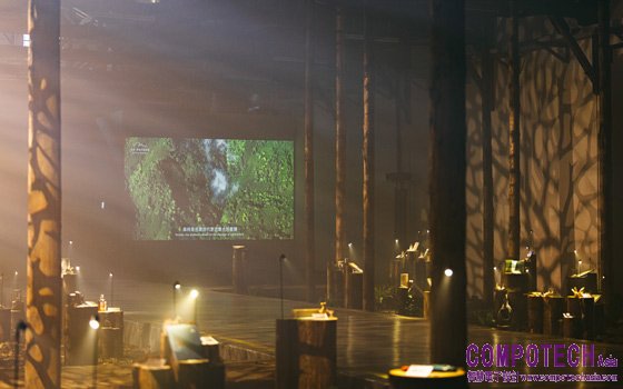 位於松山文創園區《文化策展區》的「穿霧之境」、「有河之靈」、「接海之島」、「臺灣萬水」四大主題展區,詮釋從山海地貌延伸至多元文化的韌性與活力。「穿霧之境」以枯葉鋪地與層層霧氣,引領觀眾穿越臺灣淺山與深林。展區採用 ViewSonic 8,500流明高亮度雷射投影機,其卓越亮度與廣色域還原技術,即使在多盞投射燈照明與霧氣交織的環境中,依然清晰展現山林層次與細節,營造步入靜謐霧林的沉浸體驗。投影畫面在群山與湖泊之間流暢切換,巧妙地擴展空間深度,讓觀展者彷彿登上高山休憩或佇足湖畔奉茶。