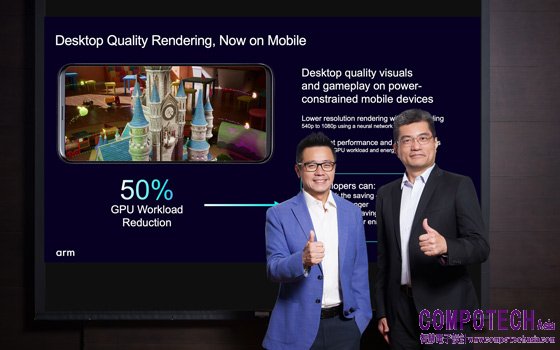 圖3:Arm 類神經技術可將高強度內容對 GPU 所產生的工作負載降低 50%。(左起)Arm 應用工程總監 徐達勇、Arm 終端產品事業部市場策略總監蔡武男