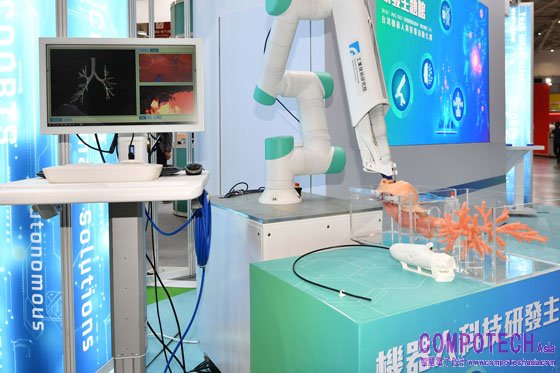 由工研院研發、全臺首創的「醫療內視鏡機器人」,無需體外穿刺大幅降低併發症,讓醫師不需穿厚重鉛衣即可遠端操控內視鏡執行肺部檢查,避免X光暴露與交叉感染。具備全向擺動、自動導航及氣道辨識,靈活操控無死角,能精準定位病灶作觀察與採樣,本技術通過細胞毒性、電性安全測試。現與臺大醫院合作驗證,未來可應用於胸腔、腸胃、泌尿等內視鏡科別。
