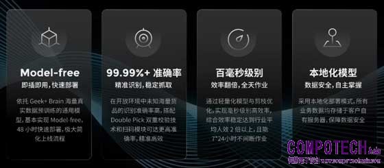 Geek+ Brain平台為極智嘉通用倉儲機械人提供「超級大腦」。而首个通用机械臂操作技术方案,通过新一代具身智能技術首次系統性地解決了海量商品形態、材質差異帶來的機械臂抓取難題,實現了全品類、全場景、高適應性的自動揀貨。該技術具備四大亮點:基於統一協同的多工感知模型、基於模擬增強的完整三維形狀預測、多維度感知以及基於強化學習的通用抓取策略,為客戶實現Model-free、99.99%+ 準確率、百毫秒級別推理以及本地化模型四大價值。該通用機械臂操作技術方案的發佈,突破了傳統機械臂受限於 SKU 差異的瓶頸,成功破解倉儲超大規模商品揀選難題,讓「無人揀選」成為現實,標誌著倉儲自動化邁入新階段。