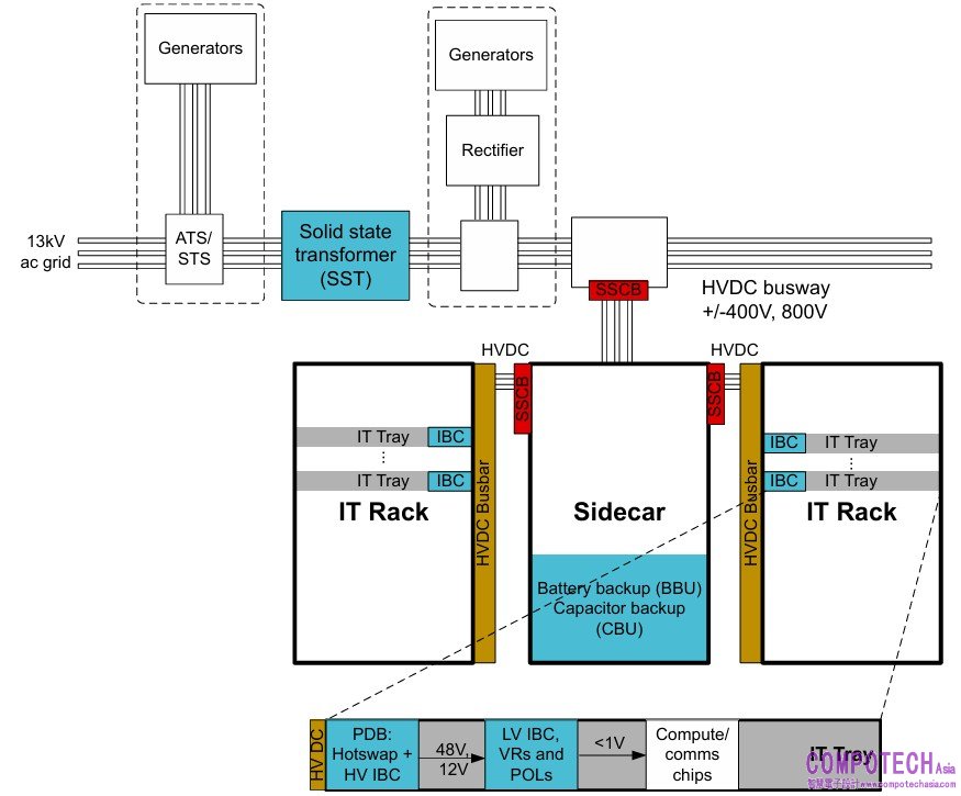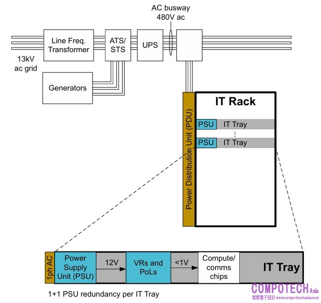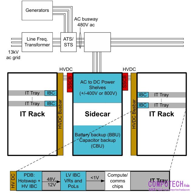每個電源櫃通常配置六個 PSU,採用 N+1 配置以實現備援能力。透過增加電源櫃數量,即可滿足 IT 機架的總電力需求。這些電源櫃的輸出為 50VDC 匯流排,透過沿伺服器機架背面佈設的高電流母匯流排,分配至每個 IT 托盤。雖然部分第二代設備保留 UPS 功能,但其他系統會將其移除(如 图 3 所示),並以本地備用電池單元 (BBU) 取代,使 50VDC 匯流排在電力恢復或備用發電機接管前維持供電。在某些情況下,電容櫃或電容備援單元 (CBU) 有助於消除因電力中斷引起的過度電壓瞬態與電流瞬態。每個 IT 托盤內的 50V 匯流排會連接至本地中間匯流排轉換器,產生 IT 托盤中系統負載所需的 12V 電壓。