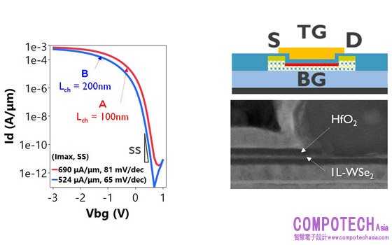 圖一:(左)採用缺陷鈍化合成形成的二硒化鎢雙原子層薄膜之2D pFET元件轉移曲線,最佳元件顯示最大電流為690µA/µm;(右)與台積電合作製出之最終雙閘極2D pFET元件的穿透電子顯微鏡(TEM)截面圖,Lch為通道長度;TG為頂層閘極;BG為後閘極;S為源極;D為汲極;IL為層間,即interlayer。