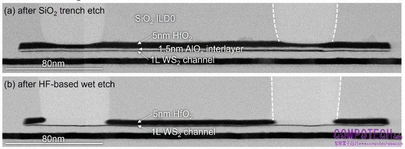 圖二:(a)溝槽乾式蝕刻穿入二氧化矽(SiO2);(b)停留在單層二硫化鎢通道的乾式與溼式選擇性蝕刻,這也導致氧化鋁層間沿著完整通道橫向移除材料(與英特爾合作)。