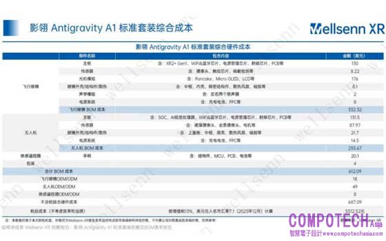 2026年1月27日--影翎 Antigravity A1 標準套裝是影石創新(688775.SH)發佈的全球首款 8K 全景無人機,以全景影像 + 沉浸式 FPV 操控為核心,提供 “一次拍攝、後期自由構圖“ 的創新體驗。該產品一經發佈,廣受產業界和消費者的關注,根據近期維深 wellsenn XR發佈的報告,影翎 Antigravity A1 標準套裝的 BOM 成本約 612.09 美元,綜合硬體成本約 687.09 美元,按美元匯率 7、增值稅 13% 計算,影翎 Antigravity A1 標準套裝的稅後綜合成本約5512.52 元。