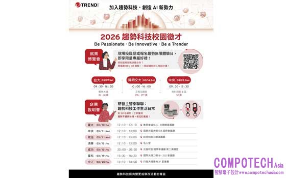 趨勢科技2026年度校園徵才計畫將於3月7日正式開跑,首場就業博覽會將於臺灣大學展開,共將舉辦3場校園就業博覽會與7場企業說明會,積極延攬能將AI前沿技術與大數據轉化為可為協助解決客戶問題所用資訊及決策動能的頂尖菁英。活動現場將由多位趨勢科技工程師、技術主管及人資分享職場實戰洞察。此外,趨勢科技也將於5月16日舉辦趨勢體驗日,邀請大專院校生到辦公室參訪,搶先體驗趨勢科技熱情活力、開放包容的企業文化;同時,趨勢科技也力邀資訊、設計相關背景的學生報名2026年暑期實習,透過實地學習與活動參與,全面提升專案開發、軟體技術、資安知識、溝通表達、簡報實戰等五大能力,開創未來職涯的新想像!即日起開放報名,名額有限、歡迎及早投遞履歷。