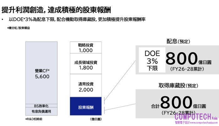 在中期經營計畫 Phase1中,包含策略性投資在內,將積極對成長領域投入資本。股東報酬方面以現金殖利率(DOE)3%為配發下限,配合機動取得庫藏股,更加積極提升股東報酬率。