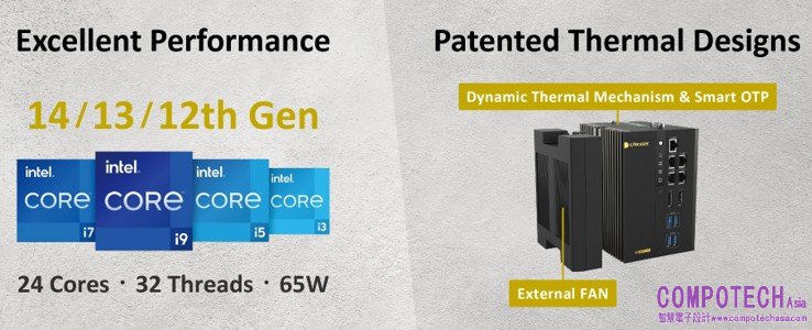 為因應機器視覺對高速影像處理與 AI 推論的需求,MD-3000 在運算效能上提供強大支援,可搭載第 14/13/12 代 Intel® Core™ 處理器(35–65W),並支援最高 96GB DDR5 記憶體與雙 NVMe SSD 儲存配置,滿足應對高強度的運算負載。能在與PLC等高的緊湊機身中(150 mm)維持穩定效能表現,關鍵在於兩大專利散熱設計。其一為專利的動態散熱機構(Dynamic Thermal Mechanism),透過優化結構設計,使 CPU 散熱塊與機殼上蓋緊密貼合,將熱能有效導出至外部散熱鰭片,並搭配外部風扇快速排熱,同時排除進塵風險。其二為 Smart OTP(Over Temperature Protection)技術,可即時監測風扇運作狀態並提供預警機制,確保系統在長時間運行下仍維持穩定與可靠。(專利號 I893729、I870277)