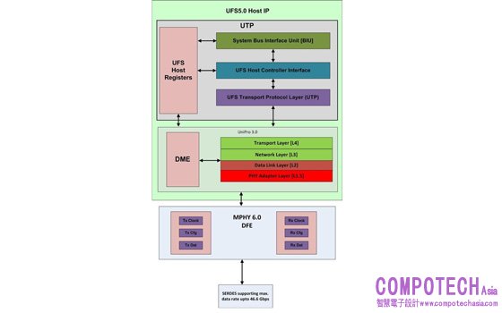Arasan UFS 5.0 Host Controller IP 方塊圖。 UFS IP 現已可用於 ASIC 及 FPGA 應用。