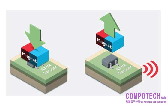AMR 感測器作為磁性開關之睡眠/喚醒功能示意:AMR 感測器可藉由偵測磁體的接近與離開,控制設備於睡眠及啟動狀態間切換。例如,當電子設備內建的 AMR 感測器偵測到磁體接近時,設備即處於睡眠狀態;當磁體離開時,則切換為運行狀態。