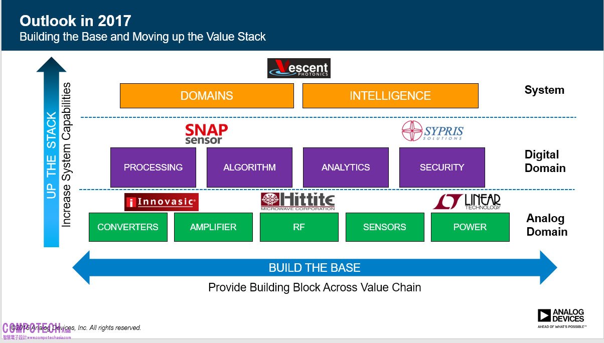ADI 認為,併購與合作並行,是物聯網時代致勝關鍵——透過自有技術與併購 Hittite、Linear Tech、Innovasic 等公司以提供轉換器、放大器、RF、感測器和電源管理等類比域的建構區塊;針對數位域,強化處理器核心、併購 SNAP Sensor 和 SYPRIS、與軟體廠商如 PTC Thingworx、微軟、Dell EMC 等公司策略合作以強化演算法、分析與安全等雲端解決方案能力;甚至在系統端,ADI 也經由併購 Vescent Photonics 擴大汽車光達技術,利於 ADAS 系統設計的完整性。