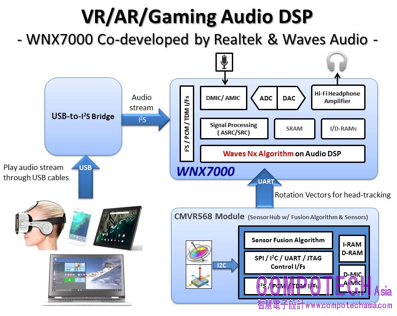 挾此優勢,Waves 今年初與在多媒體及網路通訊表現出眾的瑞昱半導體,聯手推出內嵌 Nx 技術、具 VR 音訊能力的高解析數位訊號處理器 (DSP) 晶片——Waves-Realtek WNX7000。結合瑞昱音訊編、解碼技術及 Waves 演算法,加上 Cadence- Tensilica 易於移植且高傳真的音訊 DSP IP 的助攻,成功發展出低功耗、內建放大器的音訊元件,讓一般立體聲耳機瞬間變身為 3D 高檔播放器;即使未經特殊編碼的原始音訊內容,也能獲得家庭劇院般的 5.1 / 7.1 聲道高音質。