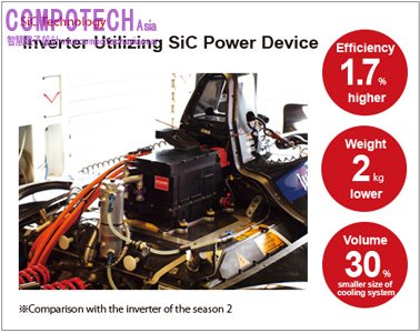 在代表最高等級電動汽車技術的電動方程式(Formula E)應用中,ROHM的SiC元件逆變器較上一代器件體積縮減三成,有效降低重量,讓Venturi車隊透過優化車輛重心設計,提升賽車性能。