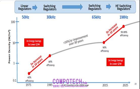 Oliver表示,速率與效率是電源設計中兩個至關重要的參數,現今常用的半導體材料有Si、SiC、GaN, Si材料可以使得晶片體積小、重量輕、成本低,而SiC僅可以提高效率節省能源,兩者不能兼得,而只有通過GaN功率IC才可以做到空前的速率和效率。另外,以功率電子的發展來看,從1975年線性穩壓器到1985年開關穩壓器發展的十年間,功率器件的尺寸減小5倍,而在1985年到2015年這三十年間,尺寸和效率都沒有很大的改變,此後GaN功率IC誕生,預計在未來十年,功率IC的尺寸將減少3-5倍左右,效率也將提升到95-99%,因此這種新材料的應用將會為整個行業帶來極大的變化。這也是我們在這個市場機會。