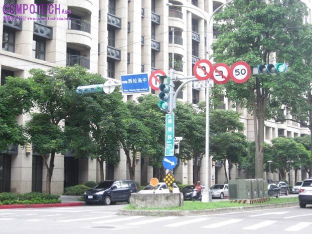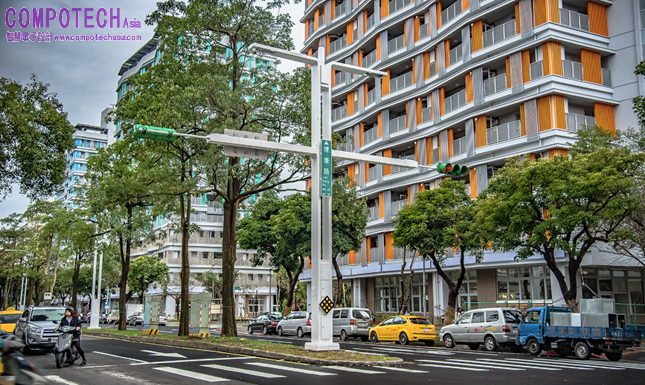 「智慧 IoT 路燈號誌共桿」示範點,在搭載 LoRa 閘道器、行動網路基地台、空氣品質感測器與 IoT 設備