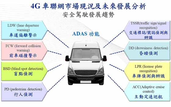 擁有 AVL 產品、電池充放電設備與 DSP IC 設計專業的李長榮說明,目前車聯網基本元素包括:定位追蹤、語音通訊、防盜、即時派遣、超速/怠速事件或電子圍籬警示、駕駛身份辨識、轉速/油耗/溫度監控、油門/煞車/方向燈等駕駛行為數據分析,以及藉由紅外線/影像/腦波偵測駕駛是否有打瞌睡或身體不適情況,進階功能就是與 Wi-Fi 影像系統及 ADAS 整合。一個典型案例是:分析行駛距離、地形、地段與車輛溫度/能耗的關係;將演算結果經由 2G/3G/4G 蜂巢通訊上傳至雲端平台,可追蹤管理派車進度、電池剰餘容量及異常偵測等。