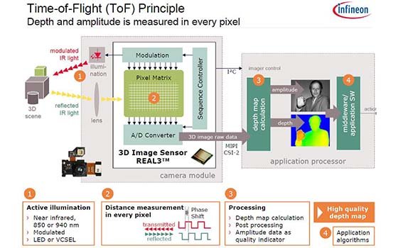 英飛凌(Infineon)2019年MWC推出第四代 REAL3™ 影像感測晶片 IRS2771C。晶片專為滿足消費性行動裝置市場,特別是以小型鏡頭提供高解析度影像的需求所設計,應用範圍廣泛,包括:臉部或手勢辨識等用以解鎖裝置及確認支付的安全驗證。此外,3D ToF 晶片也可實現擴增實境、影像變形與拍照(例如:散景) 等效果,也可用於掃描室內環境。