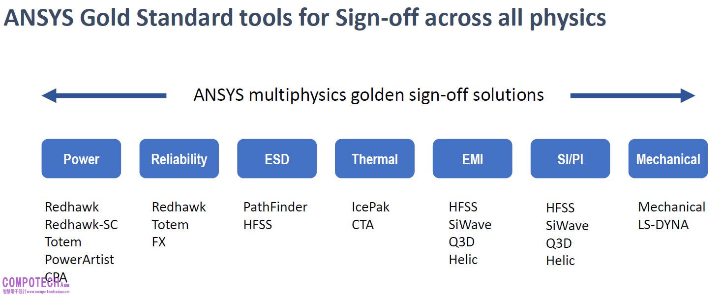 為了滿足這些要求,安矽思(ANSYS)提供了支援多尺度、多物理場(Multiphysics)以及多使用者的模擬驅動型晶片封裝系統(Chip-Package System;CPS)生態系開發方法。ANSYS技術總監Dr. Larry Williams表示,多物理場能夠模擬晶片、封裝和系統中的各種物理現象,包括功率優化、可靠性驗證(reliability)、靜電放電(ESD)、信號功率與熱完整性、電磁幹擾/電磁相容性(EMI/EMC)、電源一致性(PI)、訊號一致性(SI) 、傳熱、流體動力學與結構力學。多使用者特性使晶片、封裝和系統的設計人員能夠採用模擬平臺類比和協調各種物理現象,比如說類比IP、數位IP以及IC封裝的公司一起合作,最後再把ASIC交給其他合作夥伴,以創造越來越複雜的產品,節省產品開發和製造時間。在整個生態系中,ANSYS在每個區塊都有相應的產品以及相關的協助。