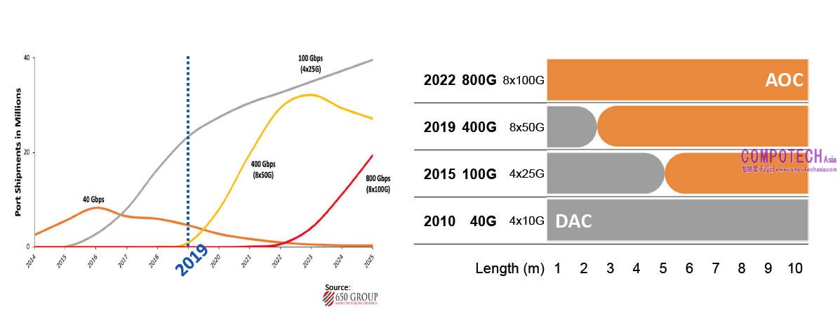 銅纜(DAC)難以滿足高速傳輸的需求,但主動光纜(AOC)成本高