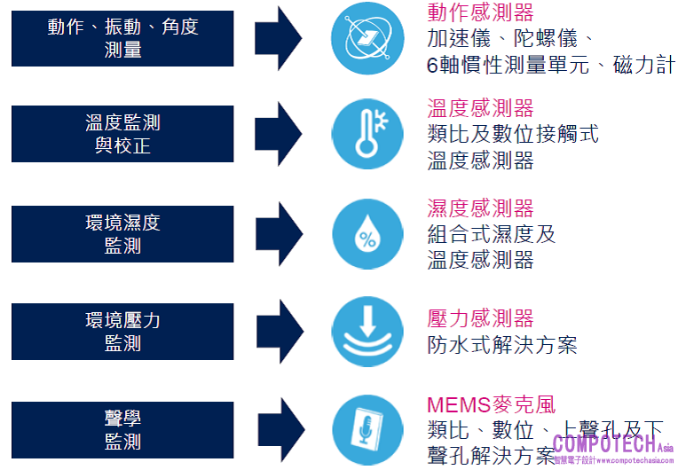 Domenico Arrigo表示,透過大量的各式不同的感測器系統,監測與預測性維護可以在工業應用中的流程及品質管控環境發揮關鍵作用。如,「空氣管理」系統的壓力測量結果,可監測連結供電網之空氣壓縮機,在不同階段下的效能指標;濕度感測器用於暖通空調系統(HVACsystems),可控制水蒸汽量,或協助調整溫度和噴出速度等參數;在苛刻的生產環境中,測量操作溫度變得非常重要,傳感系統可偵測耗損或不當的電子接連、超載、接觸不良、相位不平衡等電子相關問題,保證系統的穩定。