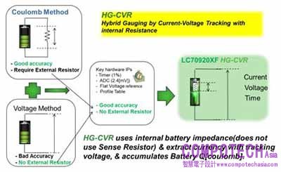 其中V(VARIED)是隨負載電流變化的電壓,V(MEAUSRED)是測得的電壓,R(INTERNAL)是電池的內部電阻。內部電阻受剩餘電量、負載電流、溫度等因素影響。HG-CVR法在監測電壓後提取電荷(庫侖),並使用電阻配置檔表和電壓配置檔表計算。