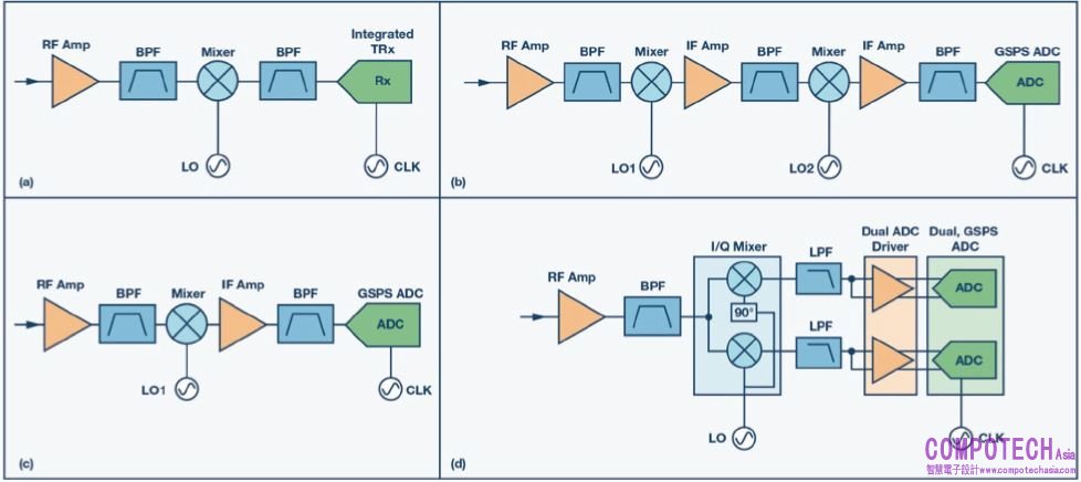 圖 ︰架構比較,(a) 高中頻( 整合TRx),(b) 雙變頻超外差架構( 帶GSPS ADC),(c) 單變頻超外差架構( 具備GSPS ADC),(d) 直接變頻( 具備I/Q 混頻器)。