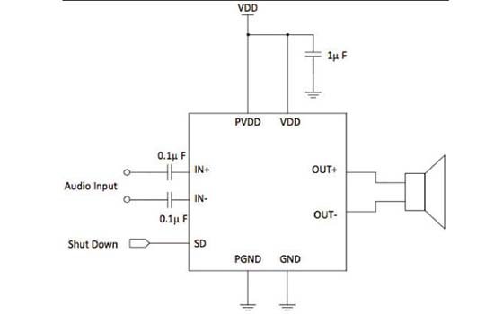 圖:Diodes 的PAM8014 免濾波D 類放大器典型實作