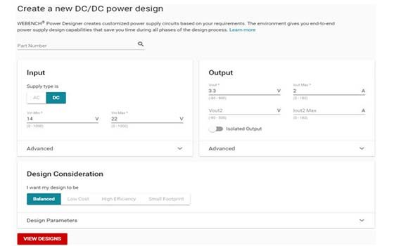 首先為重新設計的輸入參數表,如下圖1所示。您可以利用該表快速查詢所需的TI裝置,也可以透過輸入基本參數來搜尋。進階設計可以引導您完成符合任何標準的設計,並且可以調動「Design Consideration」最佳化旋鈕來進行校正。