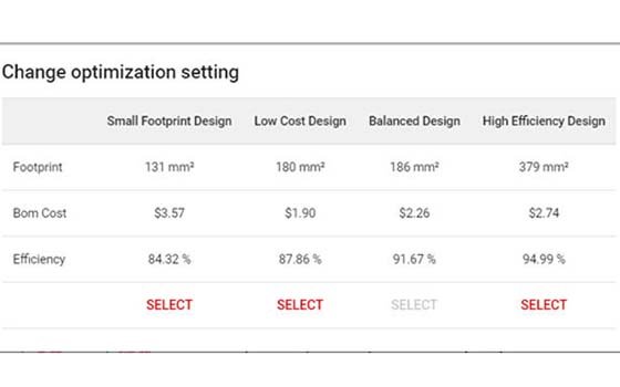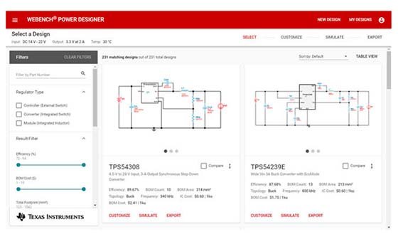 電源設計的第一步就是選擇您的設計。舊版的WEBENCH電源設計工具會計算出工作參數,並產生簡略的示意圖,而經過最佳化的新演算法現在可以幫助您實現全功率設計。我們提供多樣化的篩選工具,讓您可以選出最符合需求的設計。對於已經習慣於原先flash版本的用戶,我們仍提供表格檢視選項 。但全新的卡片檢視 (圖2)是選擇步驟中的預設畫面。