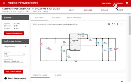 舊版WEBENCH電源設計工具中的客製化、模擬和匯出設計功能,已從單一介面區分為三個新介面,並透過多個邏輯步驟引導您完成電源設計流程。