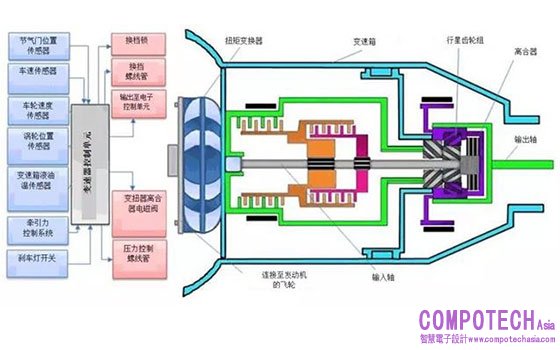 自動變速器汲取汽車發動機產生的功率,然後通過符合各種駕駛需求的不同的齒輪傳動比傳導這些功率。齒輪傳動比之所以不同,是為了確保發動機轉速(RPM)和供應給車輪的扭矩與當前車速和加速度匹配。來自發動機飛輪的動力通過扭矩變換器傳輸給變速器(見圖1)。