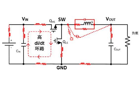 由連接走線包圍的區域決定了在此不連續電流的路徑中將存在多少寄生電感。公式1表明,流經電感的開關電流會在其兩端產生電壓差。
