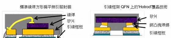 較新的DC/DC穩壓器採用德州儀器(TI)的HotRod™封裝技術。圖4比較了HotRod封裝技術和標準的線焊方形扁平無引腳(QFN)封裝。