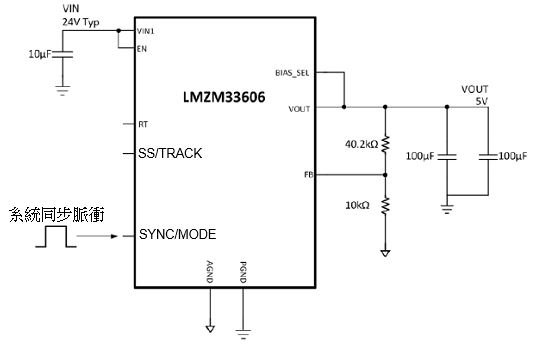 為幫助解決此問題,TI LMZM33603和LMZM33606等電源模組配備了頻率同步輸入引腳,可使系統中的所有降壓穩壓器以一個公共頻率進行切換。此功能不僅有助於避免拍頻,還能將FSW諧波保持在已知頻率。接著,設計一個減輕EMI的輸入濾波器變得更加容易。圖5所示為使用LMZM33606電源模組的典型原理圖。
