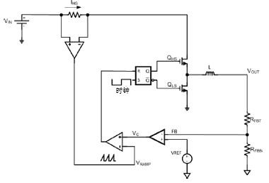 儀錶系統的輸入電壓可能為18 V至36 V的未經調壓的電壓。所有軌道的典型線路調節率可為0.1%至0.2%。在各種控制架構中,峰值電流模式(PCM)架構是可實現這種嚴格要求的架構。如圖7所示,通過檢測通過高側場效應電晶體(FET)的電流,PCM架構起作用,以產生比較斜坡。