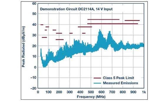 圖.:LT8603 DC2114A CISPR 25 5 類輻射EMI,30 MHz 至1 GHz。
