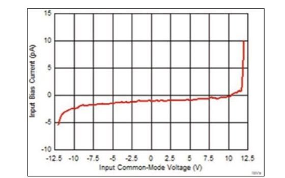 圖:OPA2810 的輸入共模電壓與偏壓電流變化圖