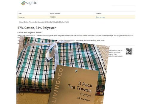 許多國家要求明確標識紡織品的纖維成分。有時這些標籤會產生誤導。例如,在下圖中,我們看到一組標有100%棉的洗碗巾,但是經Sagitto測試後,發現是67%棉和33%滌綸的混合物。