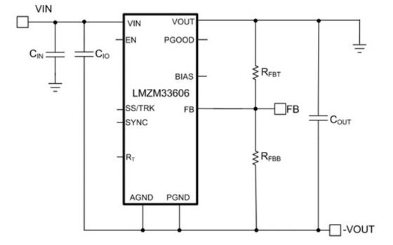 以德州儀器的LMZM33606為例。LMZM33606是一個額定輸入電壓為36V的降壓電源模組,最大負載為6A。 圖2說明了如何將LMZM33606設置為反相降壓-升壓穩壓器。