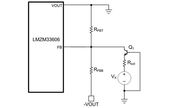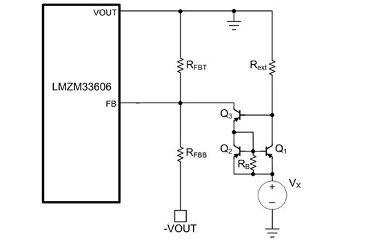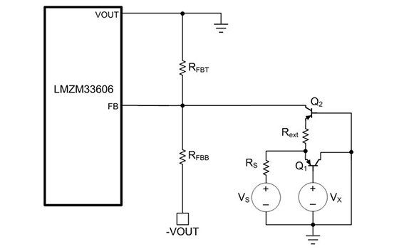 在這些降壓-升壓應用中使用LMZM33606時,可以實現-15V至-5V的可程式設計輸出電壓範圍。通過電流源方法,您能夠以絕對量級調低穩壓器的輸出。這樣,在設置回饋分頻器電阻器時,便可以將設計的默認輸出設為-15V。添加外部電流源時,您可以將穩壓器輸出設置為-5V。默認輸出為-15V時,計算的高回饋值和低回饋值分別為:
