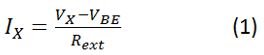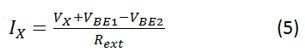 Q1電晶體的基極連接至程式控制電壓源。發射極經由一個串聯電阻器RS連接至另一個正電軌,並且集電極接地。這樣便可以在電晶體的發射極形成一個VX + VBE電壓。Q2電晶體的發射極通過電阻器RX連接至Q1的發射極。RX設置導入FB節點的電流。基極接地後,Q2發射極節點產生一個+VBE。等式5計算了流至發射極的電流(理想情況):